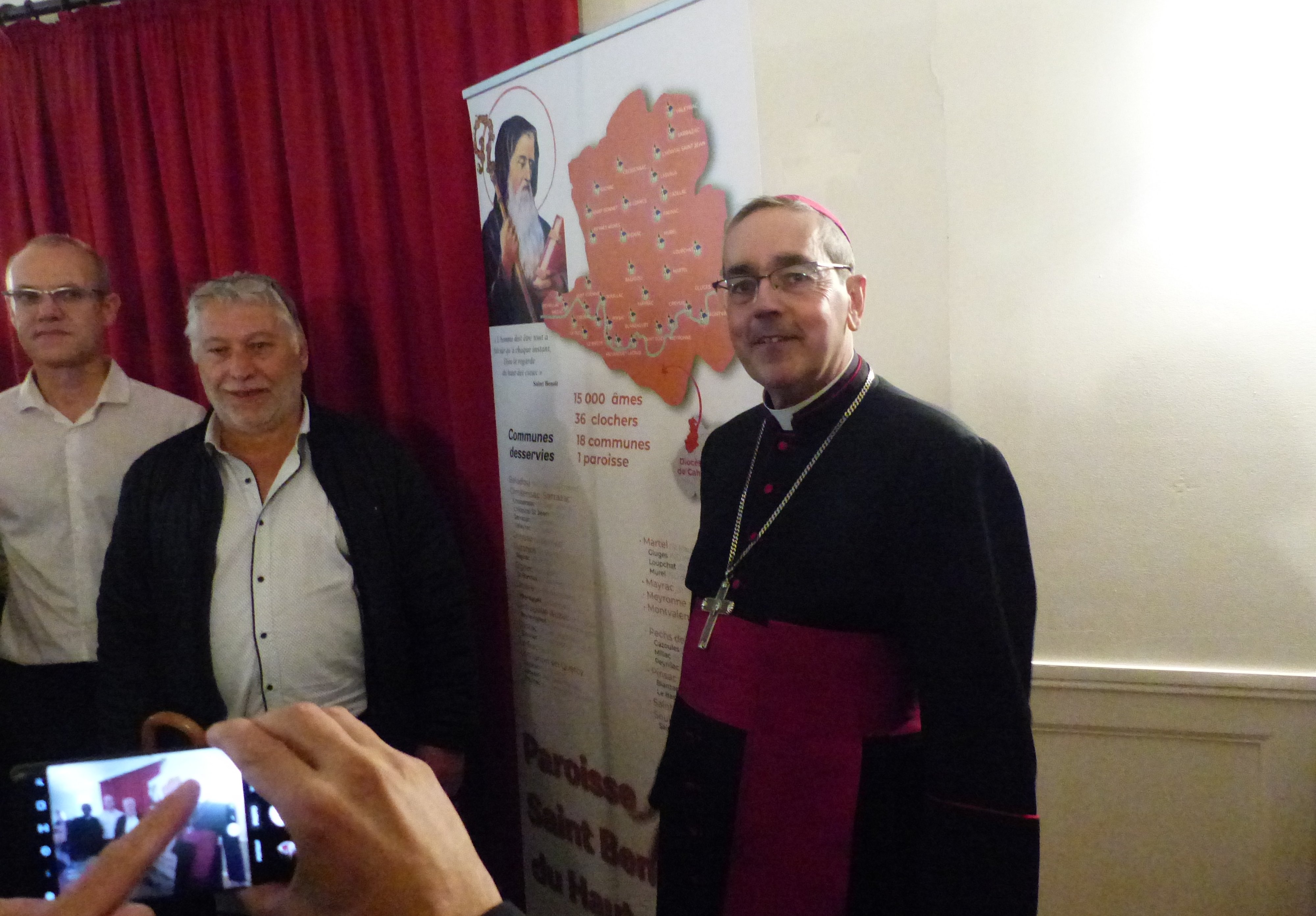 En ce jour où est érigée canoniquement la paroisse Saint-Benoît du Haut-Quercy, je suis heureux de saluer chacun de vous qui êtes présents et aussi spécialement les élus, Messieurs les maires, Madame la conseillère départementale et les autres élus. Vous nous honorez de votre présence et nous sommes heureux de partager ce moment important ensemble. Le regroupement de ces paroisses existe depuis un certain temps et l’on peut dire que l’histoire de ce territoire religieux a été préparée depuis pas mal d’années, le groupement de Cressensac notamment a été un temps rattaché à celui de Souillac, puis à celui de Martel. Aujourd’hui, on pourrait dire qu’il fait la jonction. En tout cas, le travail en commun qui se réalise est un signe important pour notre temps, un signe d’unité dynamique sans oublier personne.